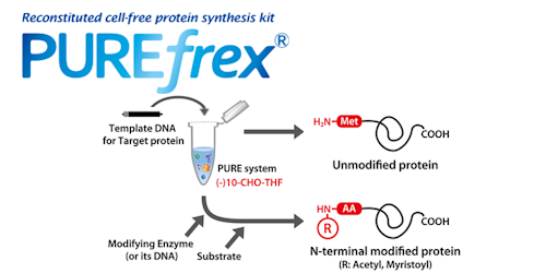 In this study, we developed a preparation method for the N-terminal modification of cell-free synthesized proteins using the PURE system (Product name: PUREfrex®). We also synthesized the modifying enzymes using the PURE system and used them without purification. This approach may be useful for evaluating the activity of modifying enzymes without using living cells. Our PURE system-based method can not only be applied to achieve acetylation and myristoylation, but also other modification.