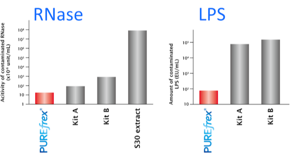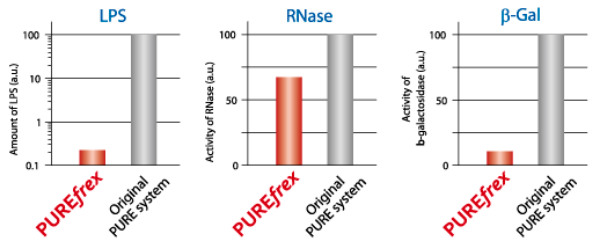 By improving the purification process of components of PUREfrex®, contamination of RNase and β-galactosidase are greatly reduced, in addition to that, lipopolysaccharide (LPS) is also reduced to less than 1 EU per 1 µL of reaction mixture. All proteinous components of PUREfrex® have no tags for purification and detection. It allows to fuse your protein with any tag to purify the product.