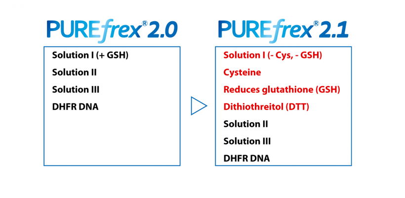 - In PUREfrex® 2.1, you can freely adjust the amount of reducing agents (Cysteine, DTT and GSH, etc.), but be sure to add Cysteine, which is a material of protein.