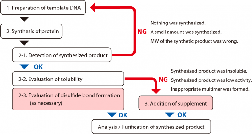 Start by preparing the template DNA suitable to the protein synthesis with PUREfrex® and examine whether the protein of interest is synthesized. Redesign the nucleotide sequence of the template DNA if too little protein is synthesized.