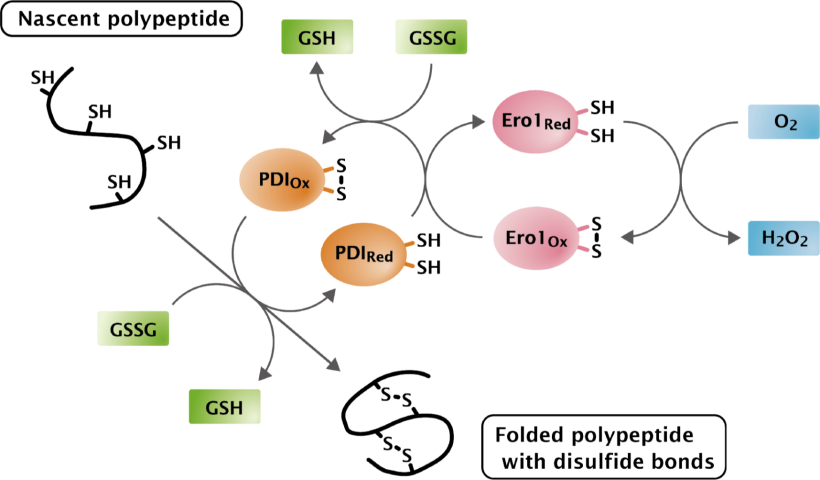 Formation of a disulfide bond is an important process for folding and stability of secretory proteins such as enzymes or antibodies. A disulfide bond is usually formed by the oxidation of sulfhydryl group (SH-) of adjacent cysteine residues. Therefore, the formation efficiency of a disulfide bond depends on redox state. Additionally, disulfide bond isomerase which can catalyze the exchange of disulfide bridges may be also required for a correct pairing of cysteines.