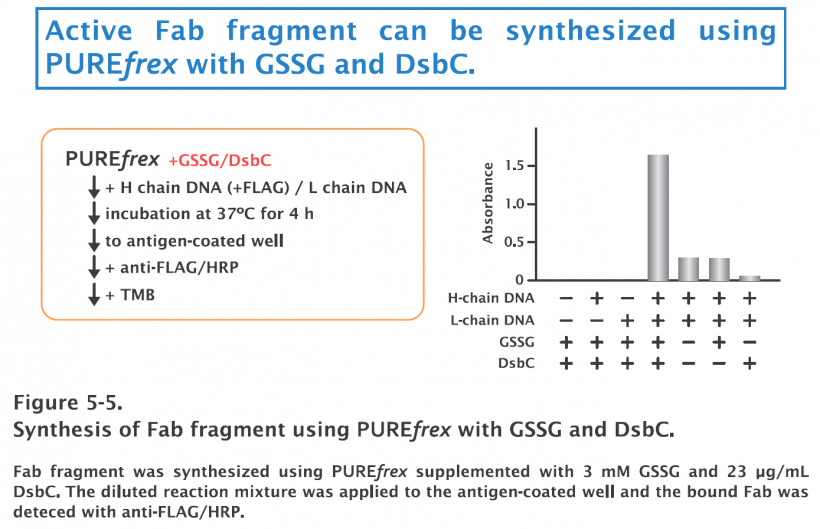 This result shows that disulfide bonds-containing proteins can be also synthesized in active form using PUREfrex supplemented with optimized concentration of GSSG and DsbC.