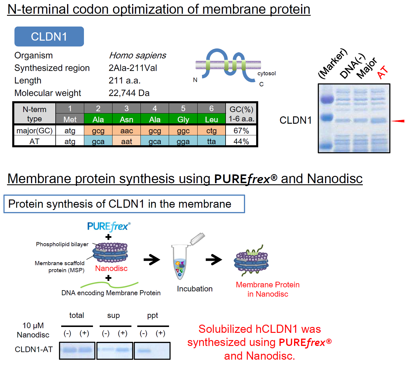PUREfrex 2.0 / DsbC Set / DnaK Mix / N-terminal codon optimization / membrane protein synthesis / nanodisc / Fab antibody / PD-1 / PD-L1 / GM-CSF / citrate synthase (Yeast Cit1p)/ prostaglandin-H2 D-isomerase (PTGDS) / CLDN1