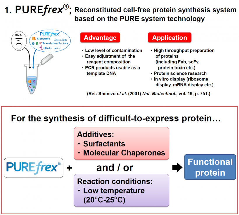 PUREfrex® is a reconstituted cell free protein synthesis kit developed based on the PURE system. Now the productivity of PUREfrex® is up to 1 mg/mL. However, depending on the protein, it may be difficult to synthesize as functional and soluble form by using only PUREfrex®.