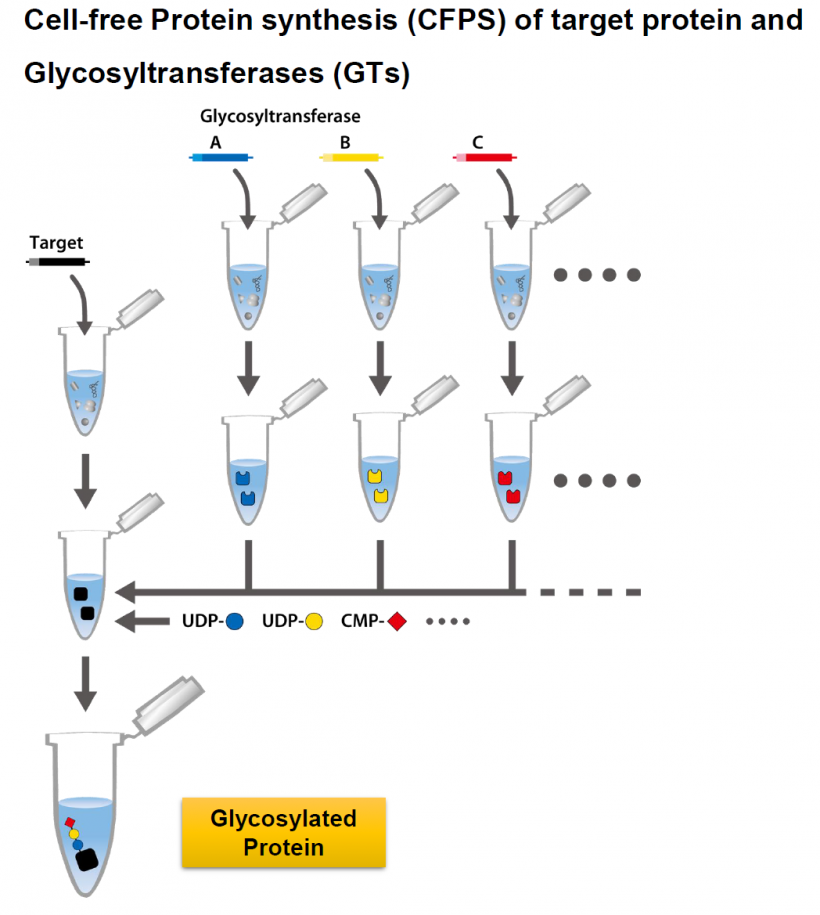The glycosylation reaction was performed with reference to the method of Jewtett et al (Kightlinger et al. (2019) Nat. Commun., 10, 5404). A model protein (Im7-6) derived from E. coli Colicin-E7 immunity protein in which an N-linked glycosylation site is inserted, and several types of glycosyltransferases were synthesized with PUREfrex®, and these were mixed with sugar donors to perform an in vitro glycosylation (IVG) of Im7-6. As a result of SDS-PAGE and mass spectrometry after IVG, enzyme-dependent addition of galactose, GlcNAc or sialic acid was confirmed starting from the addition of glucose to the asparagine (Asn) residue in the glycosylation site of Im7-6. Furthermore, when a one-pot cell-free protein synthesis-glycosylation reaction (CFPS-IVG one-pot) was carried out in which Im7-6 and glycosyltransferase were synthesized and glycosylated at the same time, glycosylated Im7-6 was confirmed by this method as well. It was also found that glycosylation is possible for disulfide bond proteins and membrane proteins by optimizing the IVG method.