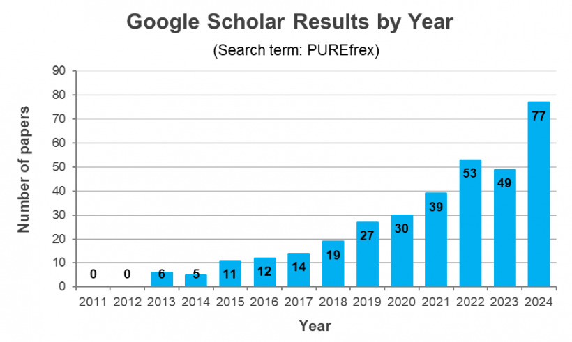 PUREfrex® has been cited in many papers and it is increasing year by year (since its launch in 2011). Papers can be searched with keywords such as product names or its applications on the Google Scholar site.