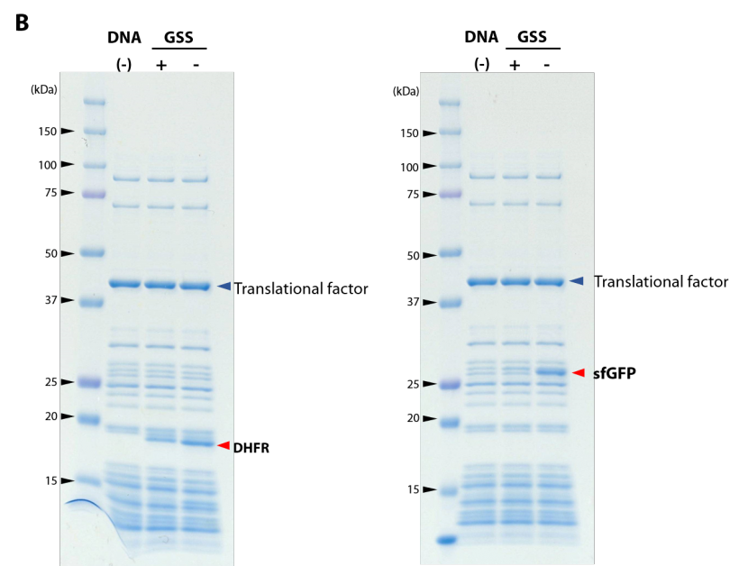 Proteins with consecutive proline residues may be produced at a low yield. A translation factor called EF-P is known to be involved in elongation at consecutive proline residues in E. coli, but the kit (PUREfrex® 2.0/2.1) contains no EF-P and may therefore produce a lower-than-normal yield. EF-P is available as a supplement (#PFS052-0.5-EX).