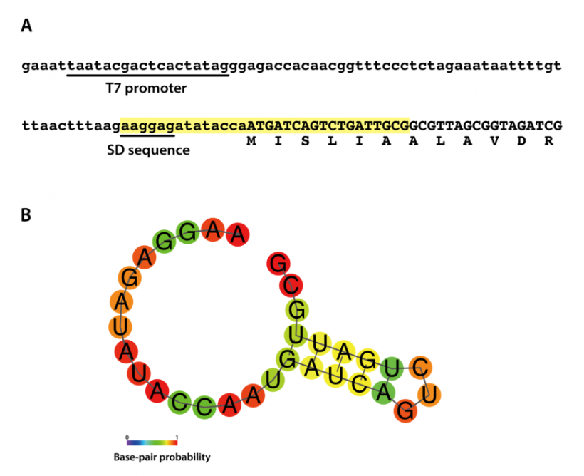 If mRNA can form a rigid secondary structure around the start codon, from SD sequence to the N-terminal of the ORF (about 6-10 codons), and SD sequence is hidden, binding of mRNA to ribosome is impaired and then the yield may be decreased. Substitute N-terminal codons with synonymous codons if a rigid secondary structure to form in this region is predicted.