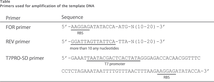 The template DNA must contain T7 promoter sequence and ribosome binding site (SD sequence) upstream of the gene encoding the protein of interest (Figure).