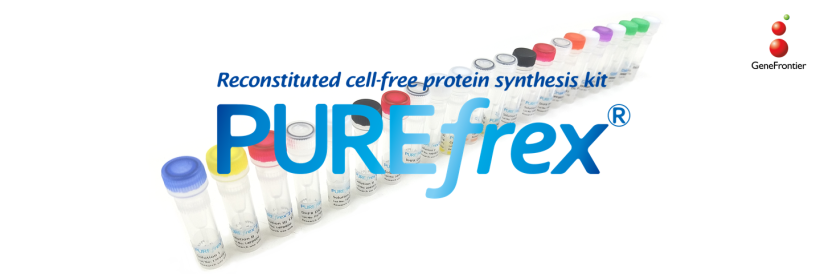 PUREfrex® is a reconstituted cell-free protein synthesis kit which GeneFrontier has developed based on the PURE (Protein synthesis Using Recombinant Elements) system technology. It consists of only purified factors necessary for transcription, translation and energy regeneration. The target protein is synthesized by adding the template DNA (or mRNA) to the reaction mixture. The synthesized protein with a tag can be easily purified because all of proteins in the PUREfrex® contain no tags.